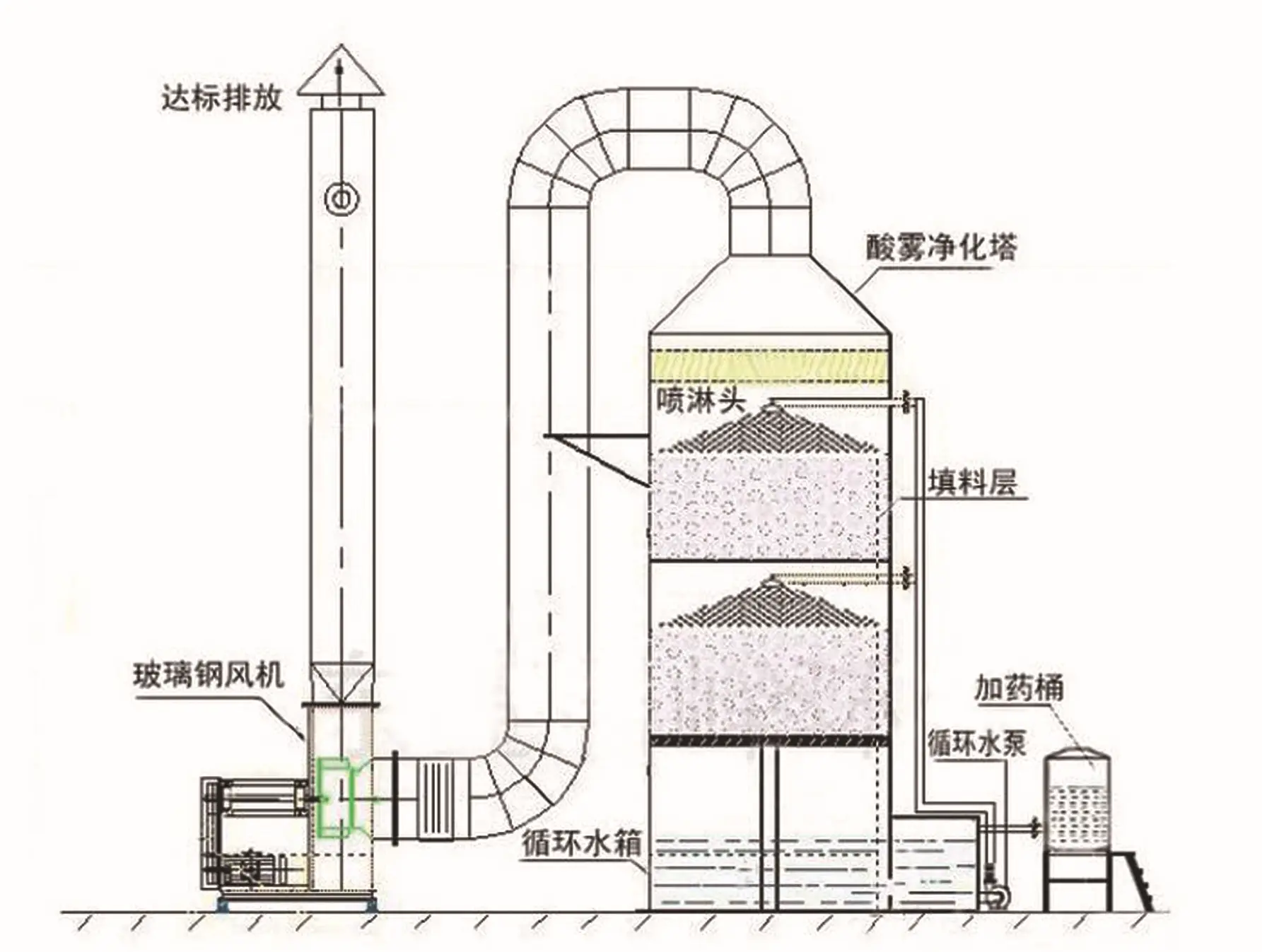 不銹鋼噴淋塔是廢氣處理工程中常用的凈化設(shè)備。是酸霧廢氣由風(fēng)管引入凈化塔,經(jīng)過填料層,廢氣與氫氧化鈉吸收液進(jìn)液兩相充分接觸吸收中和反應(yīng),酸霧廢氣經(jīng)過凈化后,再經(jīng)除霧板脫水除霧后由風(fēng)機(jī)排入大氣。
