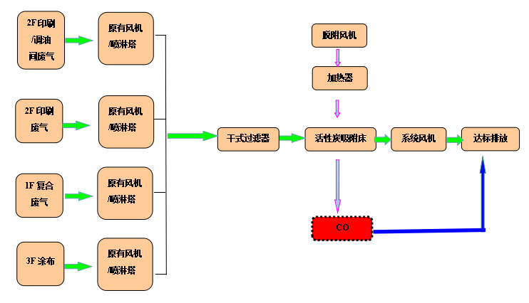 根據(jù)該公司的要求及我司有機(jī)廢氣的治理經(jīng)驗(yàn),采用干式過濾、活性炭吸附處理有機(jī)廢氣,活性炭吸附飽和以后采用CO催化氧化裝置對(duì)其進(jìn)行脫附。