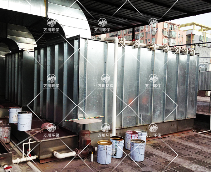 均勻安裝多層濕簾層和過(guò)濾層。水性過(guò)濾棉,不吸水,漆粉附著表面時(shí),會(huì)隨水流受重力作用被洗滌至循環(huán)水池,不易堵。濕簾層經(jīng)水洗后會(huì)在面上形成一層水膜,漆粉經(jīng)過(guò)該層被水膜黏附,對(duì)降低氣體流速,加長(zhǎng)廢氣在噴淋塔的洗滌時(shí)間有重要作用。廢氣經(jīng)過(guò)除霧層(即氣水分離)后,再進(jìn)行活性炭吸附塔吸附。該法具有處理效果高,運(yùn)行穩(wěn)定優(yōu)點(diǎn)。