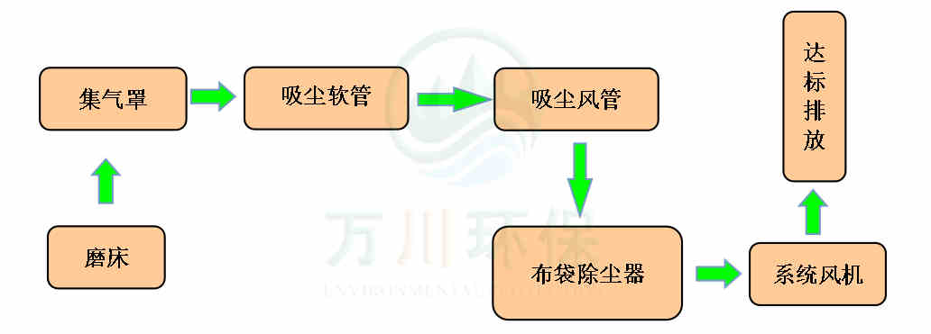 磨床生產(chǎn)時產(chǎn)生的粉塵通過集氣罩、吸塵軟管進入到脈沖布袋除塵器中過濾凈化,粉塵落入灰斗,凈化后的廢氣通過系統(tǒng)風(fēng)機達標(biāo)排放。