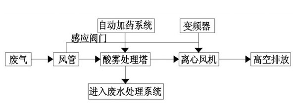 酸霧廢氣由風(fēng)管進(jìn)入酸霧處理塔,自下而上穿過填料層;循環(huán)堿液吸收劑由塔頂通過螺旋噴嘴,形成的水霧勻地噴淋到填料層中,沿著填料層表面向下流動,進(jìn)入循環(huán)水箱。由于上升氣流和下降霧化吸收劑(堿液)在填料中不斷接觸,上升氣體中流質(zhì)的濃度越來越低。使其酸霧得到凈化,達(dá)標(biāo)排放。